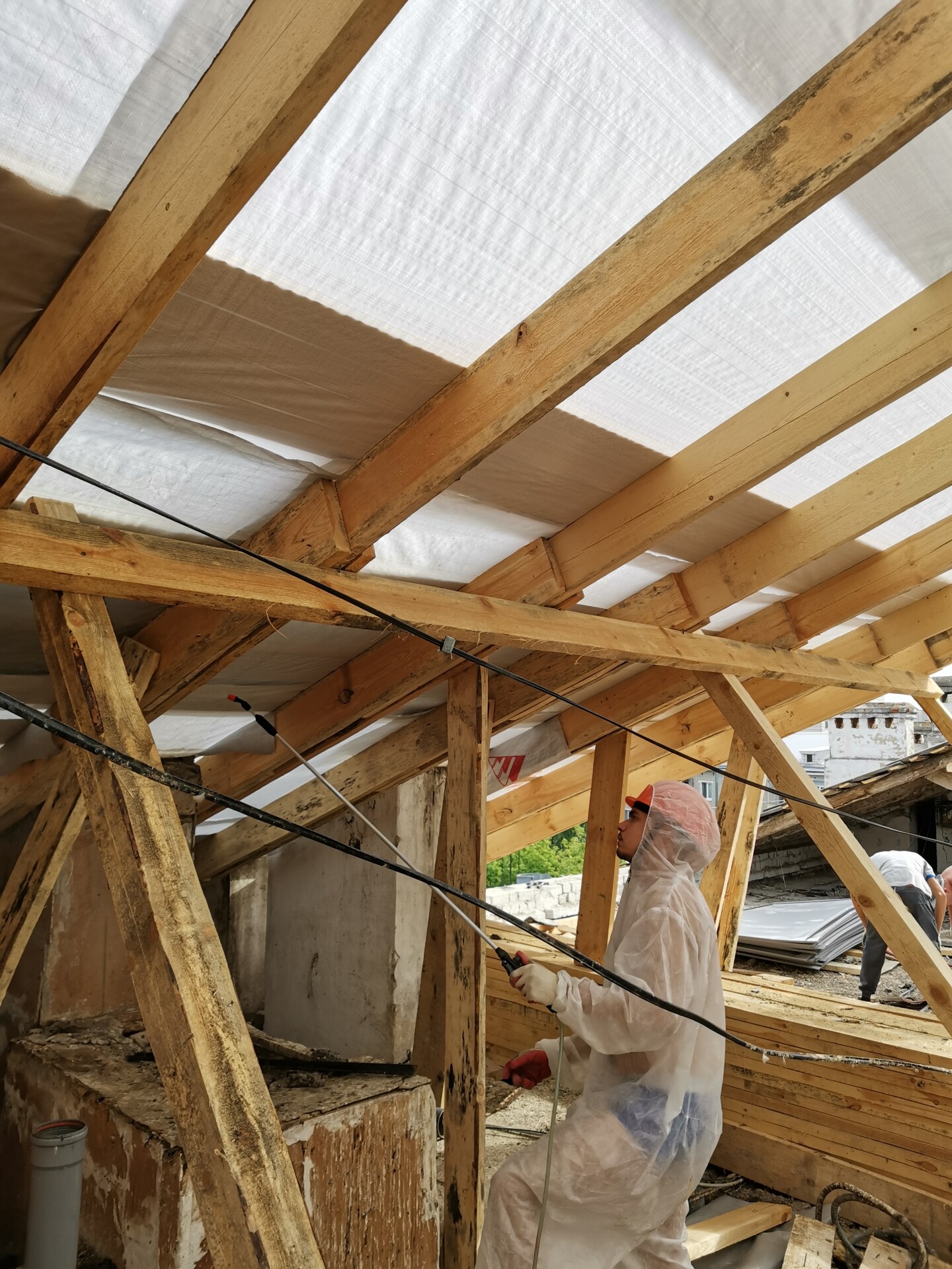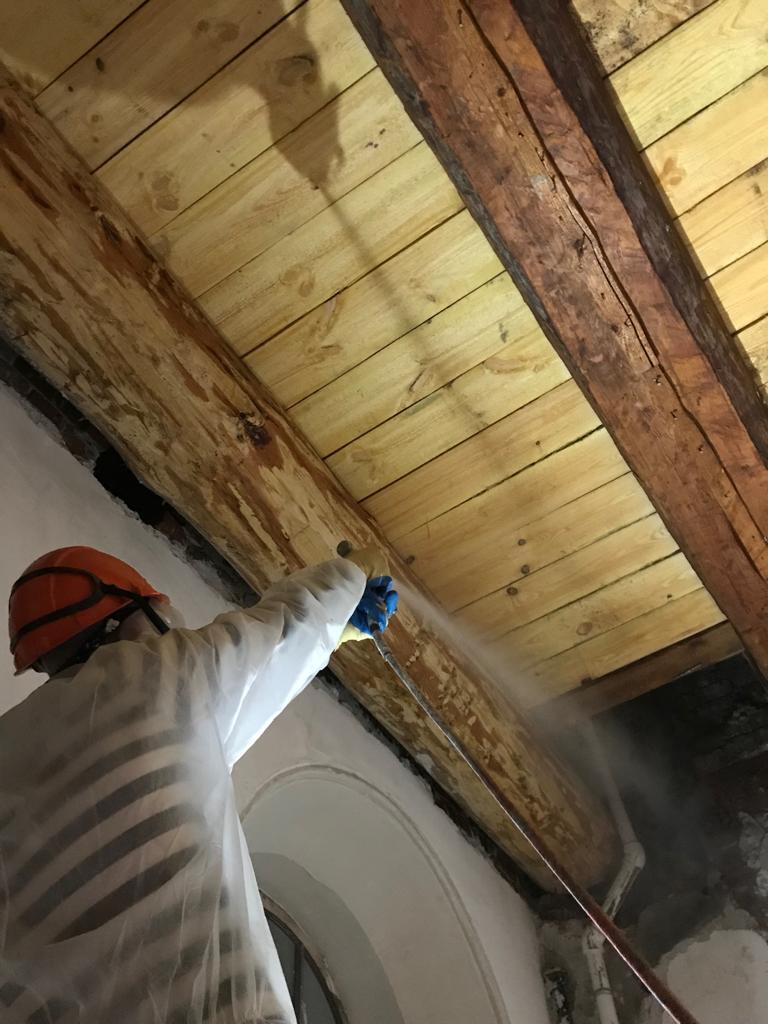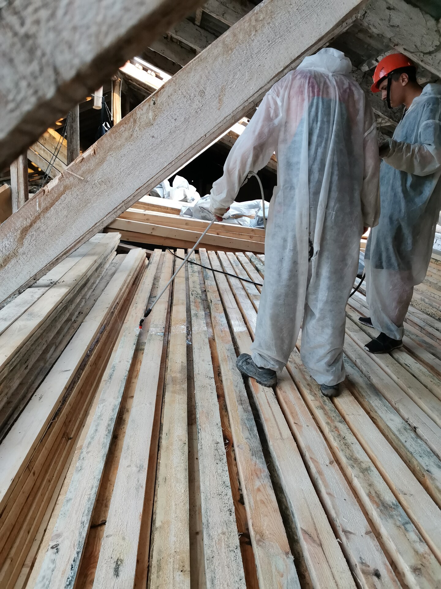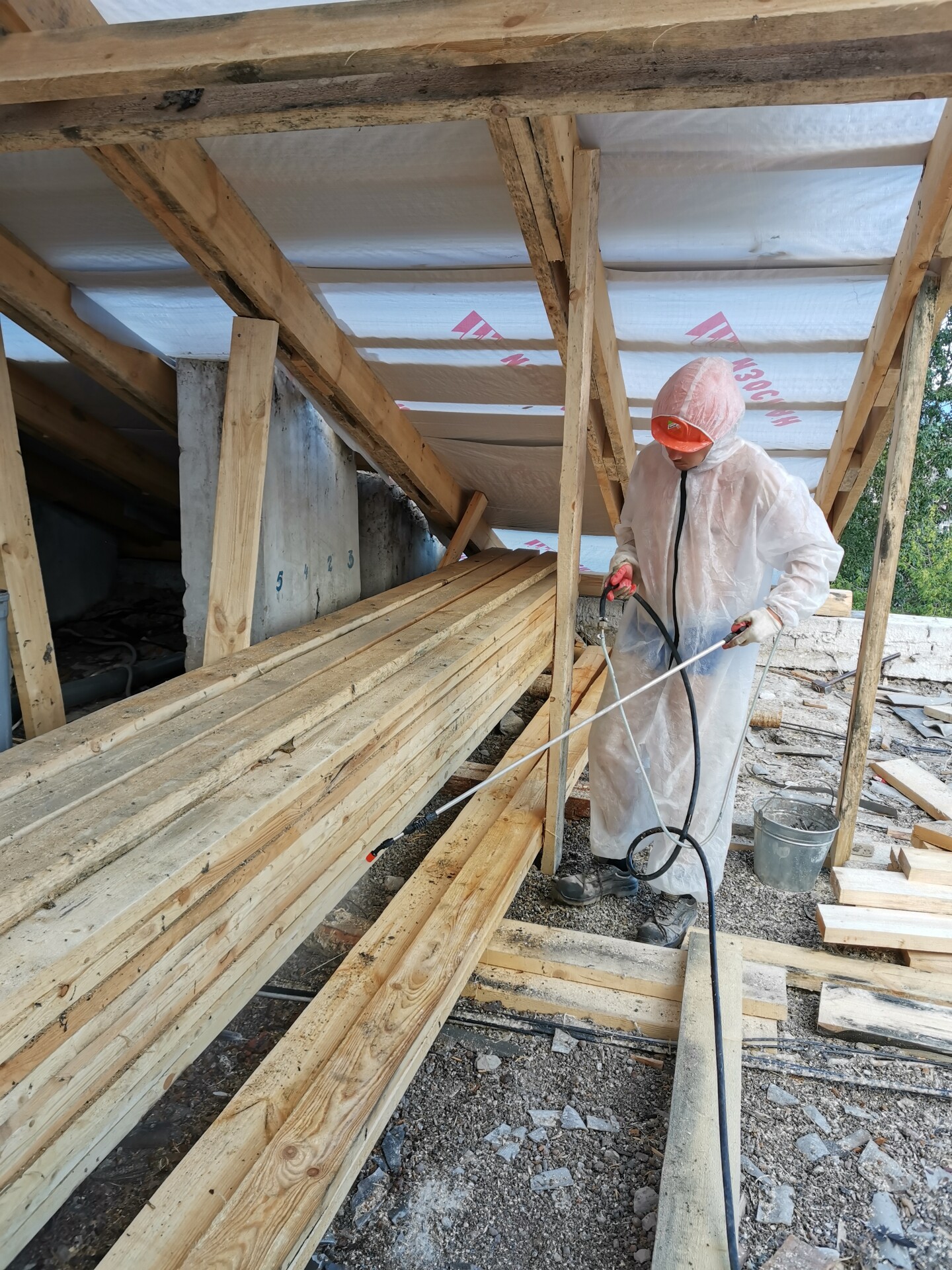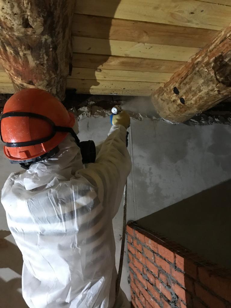 Огнезащитные составы наносятся методом пневмораспыления с помощью насоса, либо аккумуляторных рюкзаков в труднодоступных местах. Применяемые составы: ВПРОТЕК-3 (огне), ВУПРОТЕК-2 (био), порошкообразное вещество, бесцветное, не токсичны, 1 группа огнезащитной эффективности.