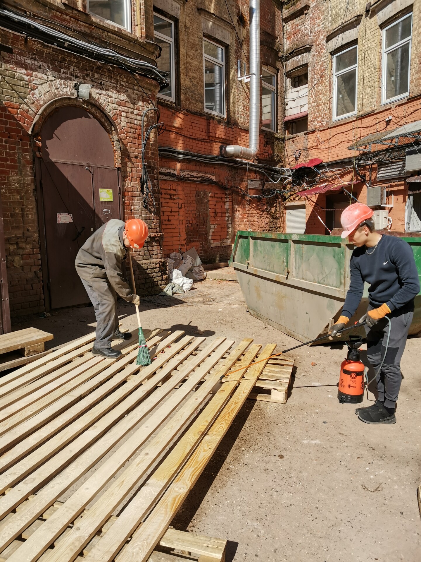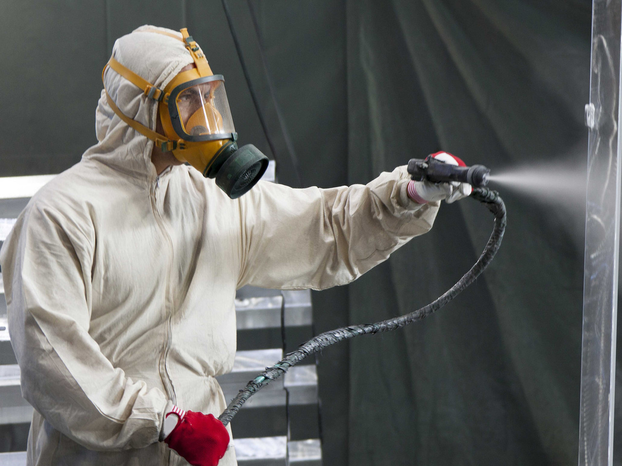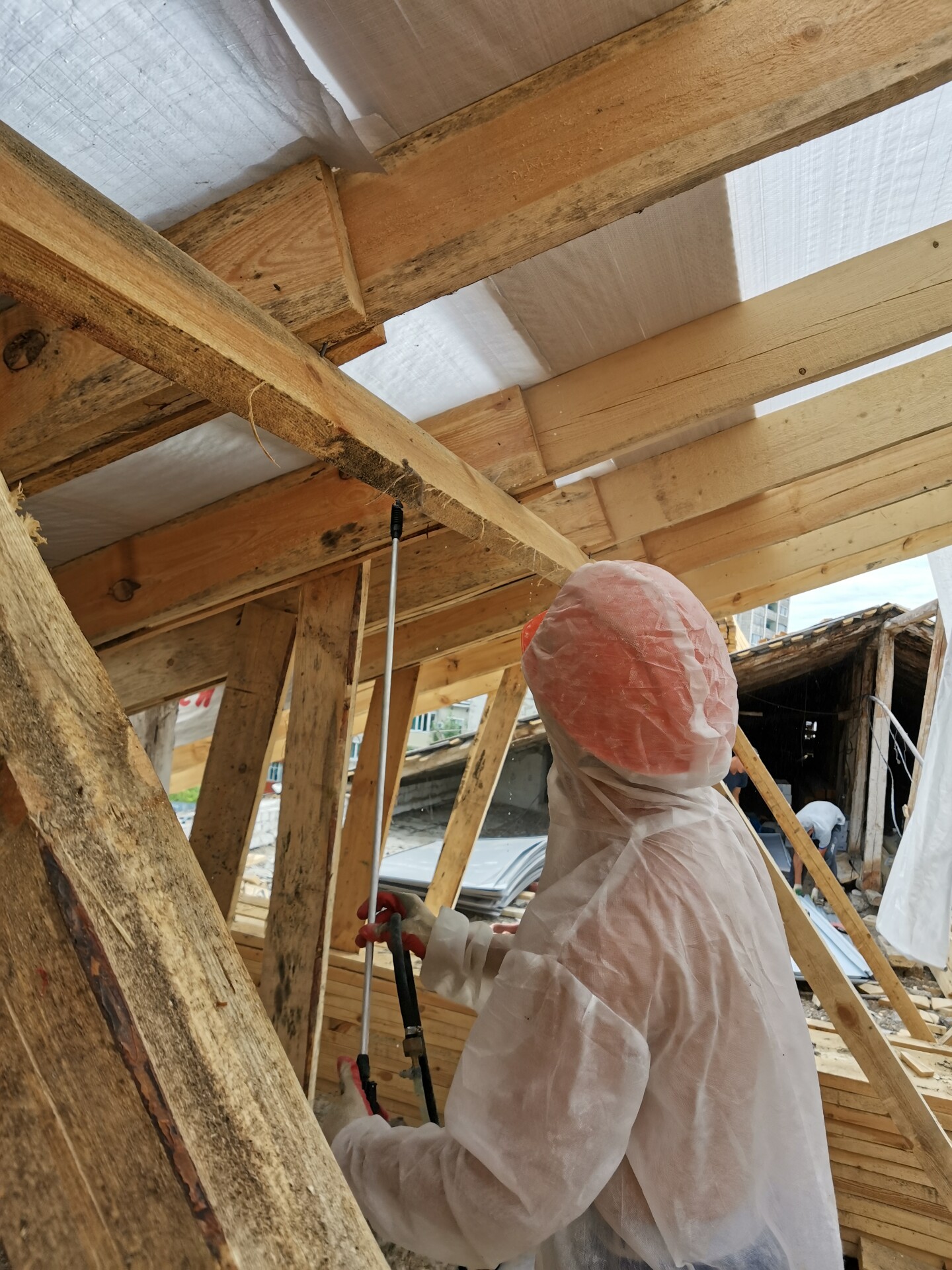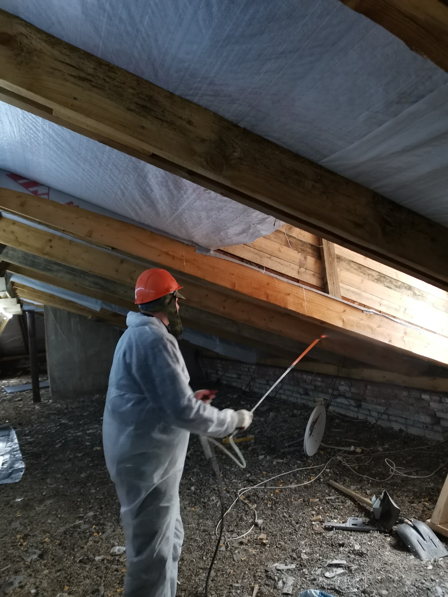 Огнезащитные составы наносятся методом пневмораспыления с помощью насоса, либо аккумуляторных рюкзаков в труднодоступных местах. Применяемые составы: ВПРОТЕК-3 (огне), ВУПРОТЕК-2 (био), порошкообразное вещество, бесцветное, не токсичны, 1 группа огнезащитной эффективности.
